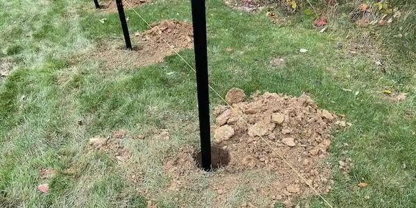 The first step when setting the support posts is to determine the location of the fence by setting stakes and string line at the ends of the fence. Use a measuring tape to locate the support pole holes and mark each hole spots with spray paint. Then, dig a hole for each post using a post hole digger or powered auger, making sure that the holes are deep enough to support the height of the fence. Typically 3 to 4 ft deep for a 6 to 8 ft high wall.