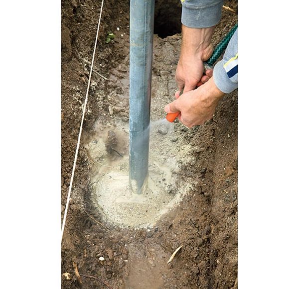 Place the fence post in the hole, making sure it is level, and then pour concrete mix around the fence post holes. Premixed bags of concrete may be mixed by hand in a wheelbarrow with a shovel, or with a powered concrete mixer. Allow the concrete to dry completely before proceeding to the next step.