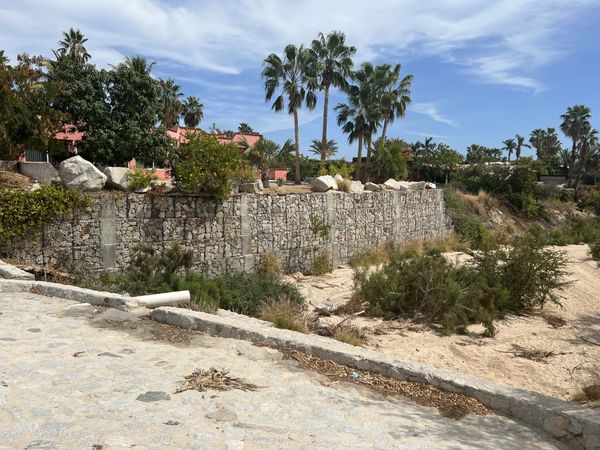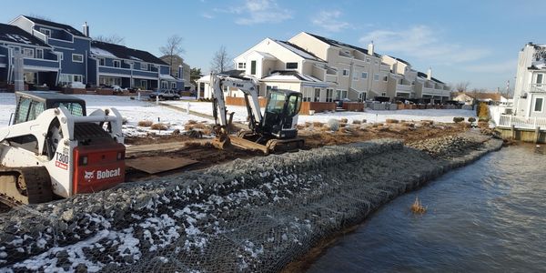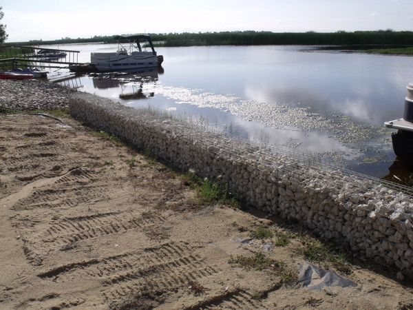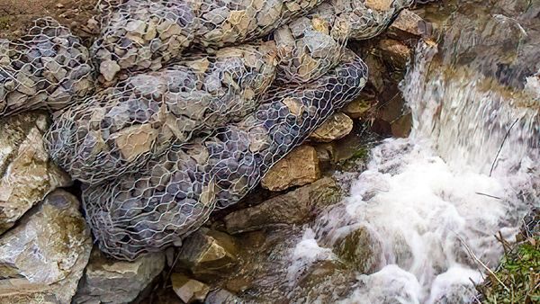 Constructing a rock filled gabion basket wall along a waterway is an ideal solution for preventing soil or beach erosion. Since gabions can be stacked, they are suitable for steep banks and channel linings. They conform to ground movement and are permeable, that allows water to drain freely and prevents the buildup of hydrostatic pressure behind them. The rock filled baskets with a layer of a porous geo-textile fabric allows water to flow freely through the rocks while keeping the soil in place. Plus it helps to dissipate water flow energy since the gaps between the rocks trap and slow the flow of water.